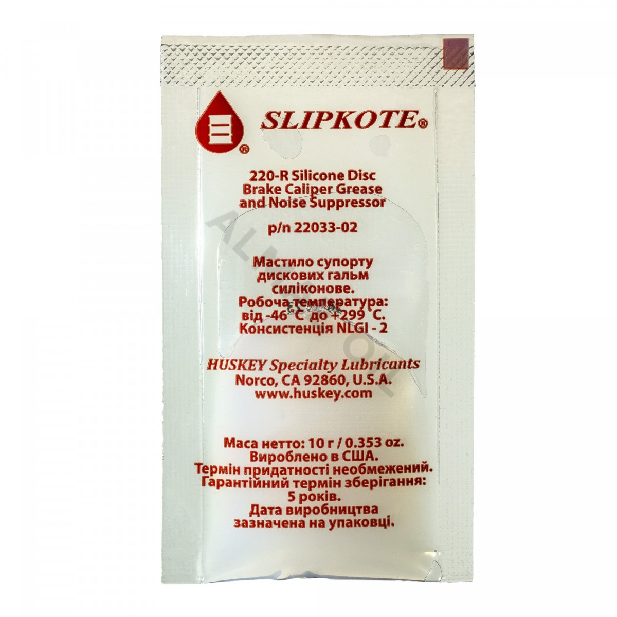 Huskey Slipkote 220-R Silicone DBC Grease - высококачественная силиконовая смазка для суппорта дискового тормоза на основе полидиметилсилоксановых базовых масел и синтетического загустителя. Обеспечивает максимальную защиту сопряженных деталей в широком температурном диапазоне (интервал рабочей температуры от –46 до +299 °С). Устраняет скрежет и шум, возникающий при работе тормозов. Неплавящаяся, обладает высокой диэлектрической прочностью и низкой испаряемостью, нерастворима в воде, метаноле, этаноле, разбавленных кислотах и щелочах, тормозной жидкости, растительных и минеральных маслах, гликоле и глицерине. Совместима с большинством пластмасс и эластомеров, в особенности с каучуком на основе сополимера этилена, пропилена и диенового мономера (EPDM) и тройным этиленпропиленовым сополимером (EPT), обычно используемых в суппортах дисковых тормозов.